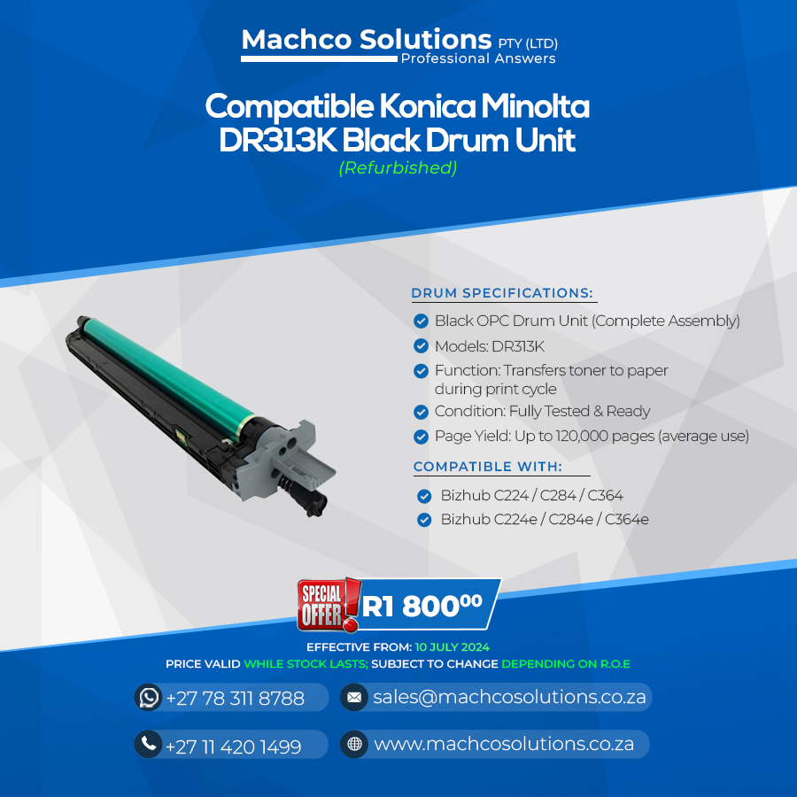 The Compatible Konica Minolta DR313K Black Drum Unit is a complete replacement drum built to deliver crisp, clear, and consistent black prints. Perfect for busy offices or professional environments that demand reliability and performance comparable to OEM parts — at a fraction of the cost.