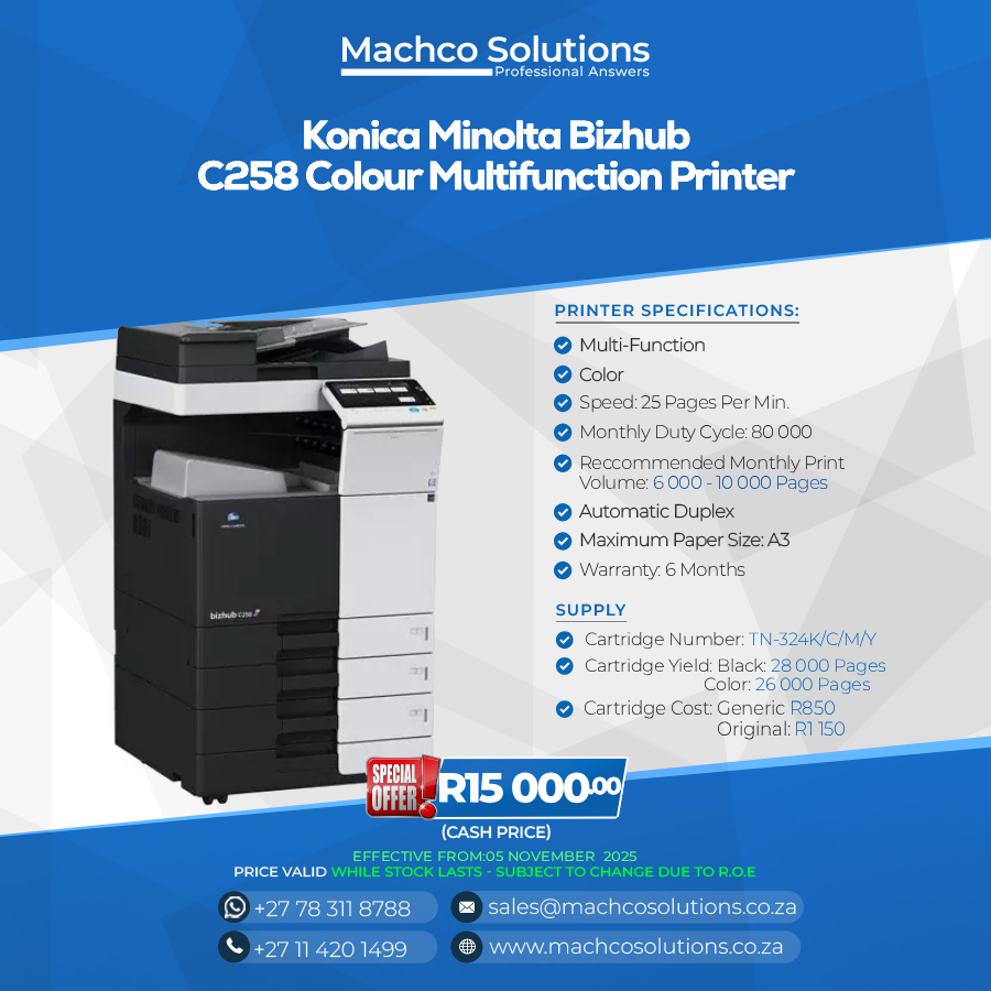 Built to be efficient and reliable, the Bizhub C258 balances performance and cost-effectiveness, making it an ideal choice for offices that need consistent quality, productivity, and versatility without unnecessary complexity.