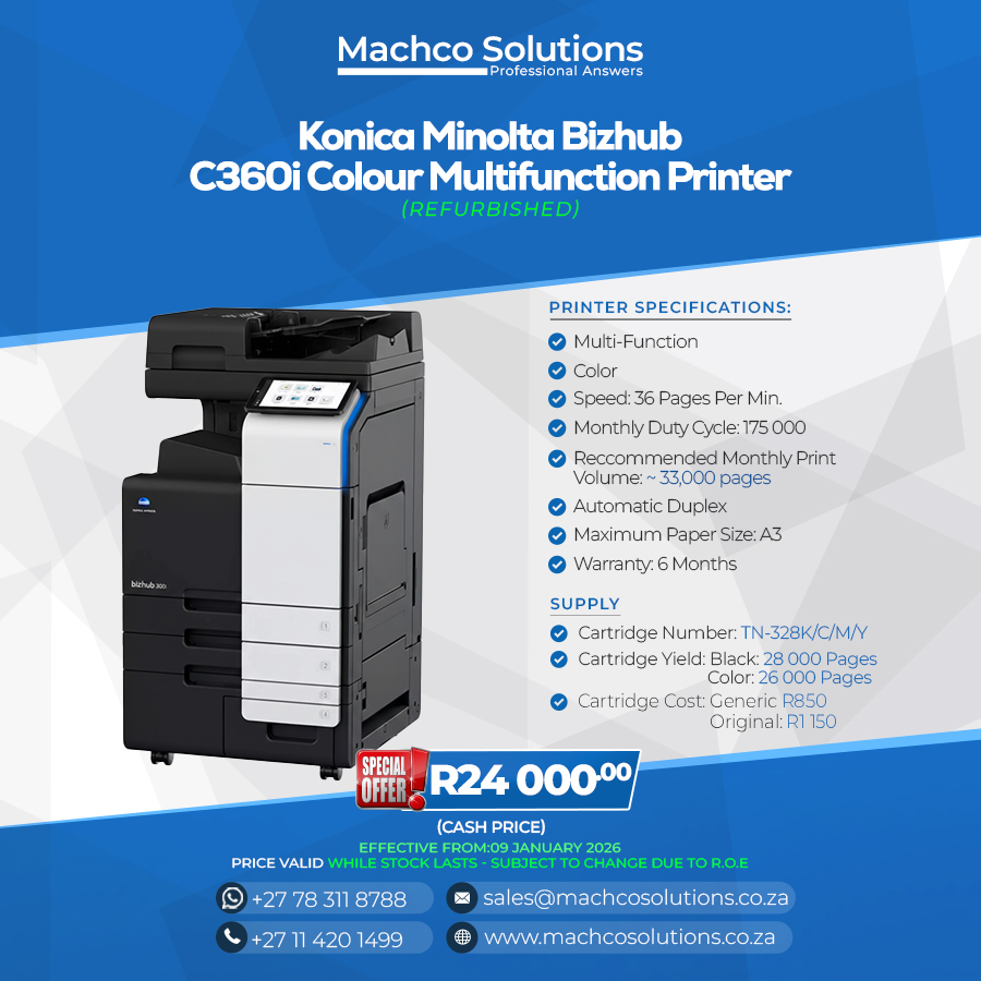 Whether you’re printing internal documents, marketing materials or large format visuals, the bizhub C360i is engineered to bring reliability and professionalism to your workspace.