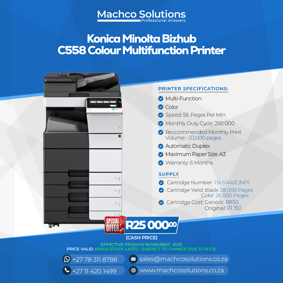 Elevate your office printing with the bizhub C558 — a full‑colour, high‑performance multifunction printer built for busy workgroups and departments. With lightning speeds up to 55 ppm for both colour and black & white, you’ll stay ahead of deadlines without compromise. Duplex printing and large‑format support (up to SRA3) mean you’re ready for everything from standard documents to creative layouts and presentations.